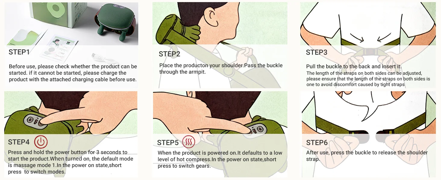 Smooth operation of the product: First of all, the product should be placed in the massage area, take the massage neck as an example, put the product on the shoulder, after the smooth placement, pull the buckle to the back and plug in, at the same time,long press the power button for 3 seconds to start the product, short press the power button to switch the massage mode.